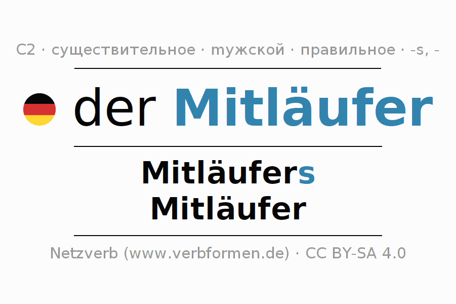 Склонение существительного Mitläufer (номина́льный член, попу́тчик) даётся в родительном падеже единственного числаMitläufers и в именительном падеже множественного числа Mitläufer. Существительное Mitläufer склоняется по сильному типу, получая окончания s/-. Грамматический род Mitläufer мужской с определённым артиклем "der" Здесь можно просклонять не только Mitläufer, но и все немецкие существительные. Существительное включён в словарный запас обладателя сертификата знания немецкого языка уровня C2. Kомментарии ☆