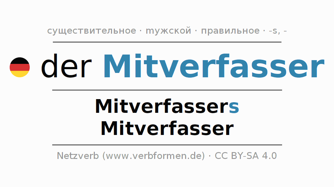 - Множественное число: die Mitverfasser, der Mitverfasser, den Mitverfassern, die Mitverfasser