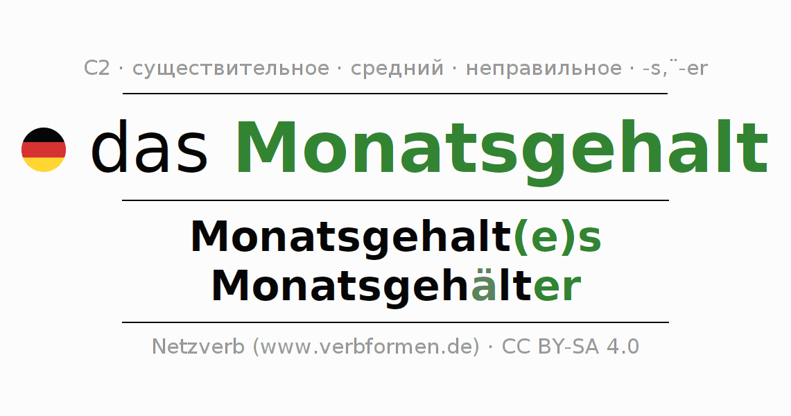 - Множественное число: die Monatsgehälter, der Monatsgehälter, den Monatsgehältern, die Monatsgehälter