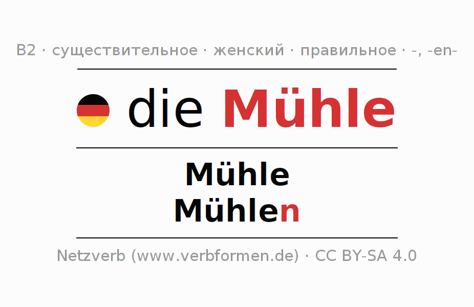 - Множественное число: die Mühlen, der Mühlen, den Mühlen, die Mühlen