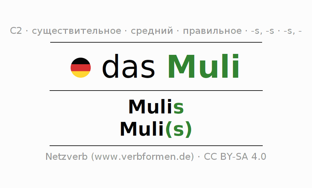 - Множественное число: die Muli(s), der Muli(s), den Muli(s), die Muli(s)