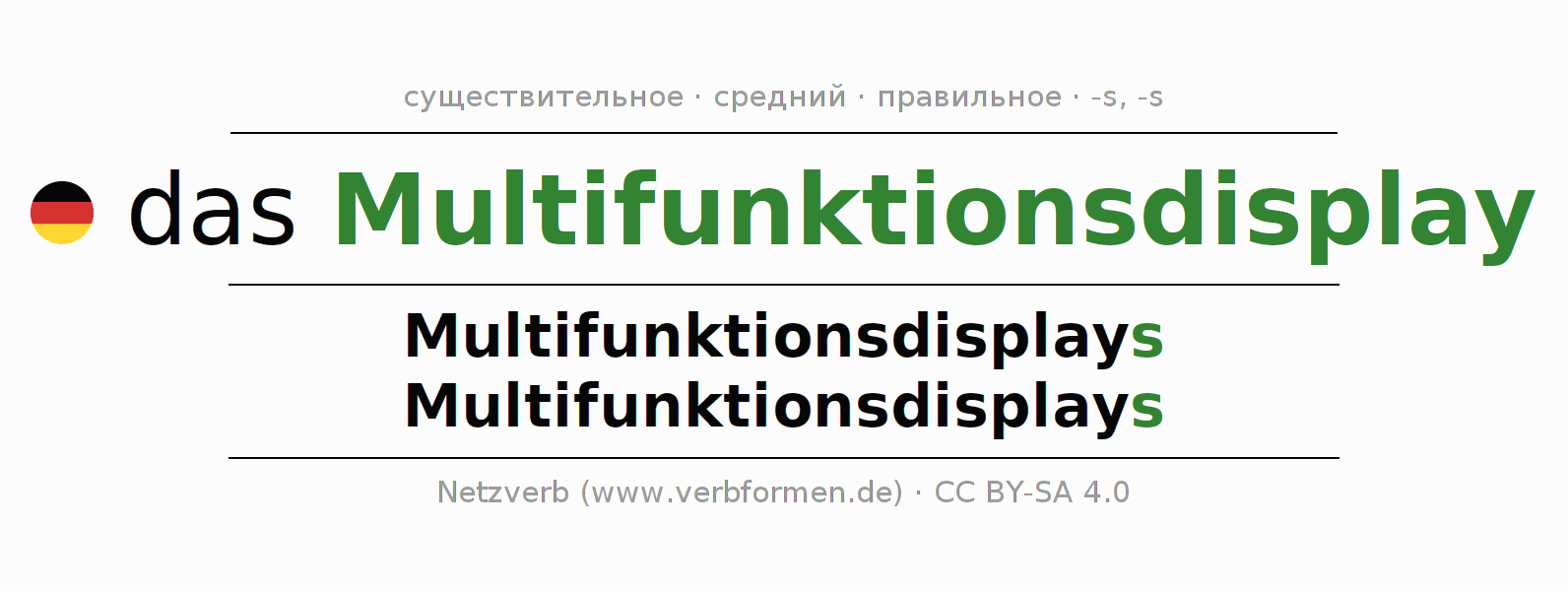 Склонение существительного Multifunktionsdisplay (многофункциональный дисплей) даётся в родительном падеже единственного числаMultifunktionsdisplays и в именительном падеже множественного числа Multifunktionsdisplays. Существительное Multifunktionsdisplay склоняется по сильному типу, получая окончания s/s. Грамматический род Multifunktionsdisplay средний с определённым артиклем "das" Здесь можно просклонять не только Multifunktionsdisplay, но и все немецкие существительные. Kомментарии ☆