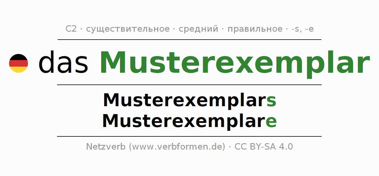 - Множественное число: die Musterexemplare, der Musterexemplare, den Musterexemplaren, die Musterexemplare