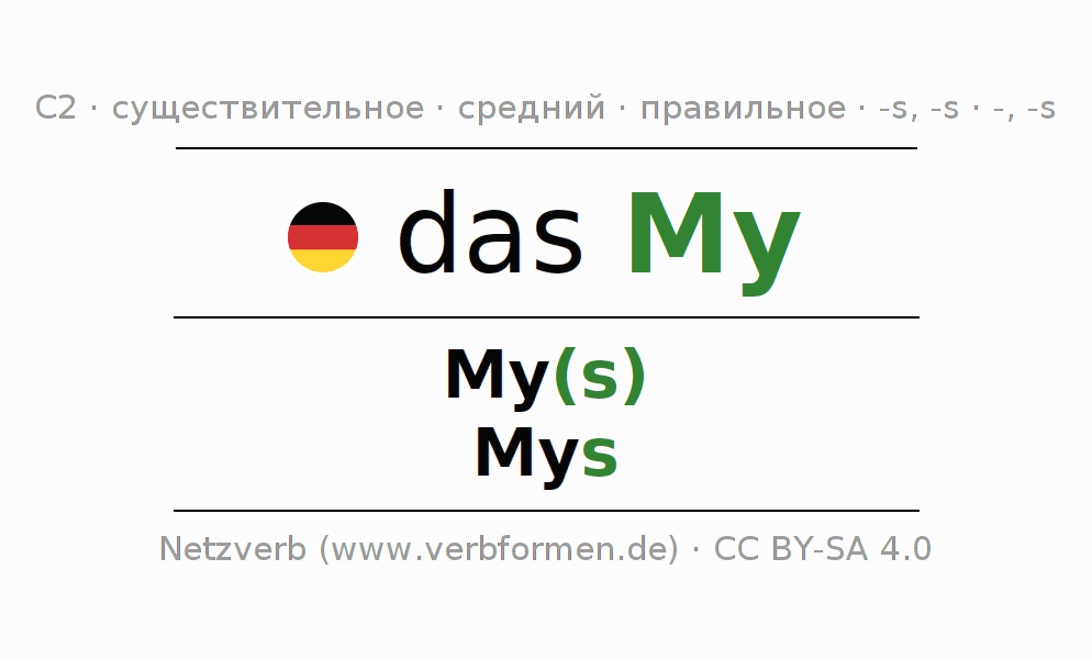 Склонение существительного My (ми) даётся в родительном падеже единственного числаMy(s) и в именительном падеже множественного числа Mys. Существительное My склоняется по сильному типу, получая окончания s/-/s. Грамматический род My средний с определённым артиклем "das" Здесь можно просклонять не только My, но и все немецкие существительные. Существительное включён в словарный запас обладателя сертификата знания немецкого языка уровня C2. Kомментарии ☆