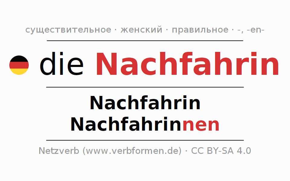 - Единственное число: die Nachfahrin, der Nachfahrin, der Nachfahrin, die Nachfahrin