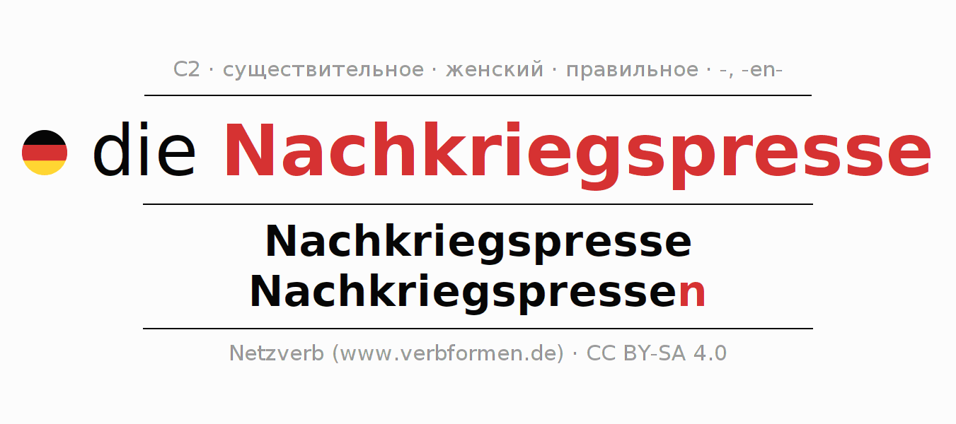 - Единственное число: die Nachkriegspresse, der Nachkriegspresse, der Nachkriegspresse, die Nachkriegspresse