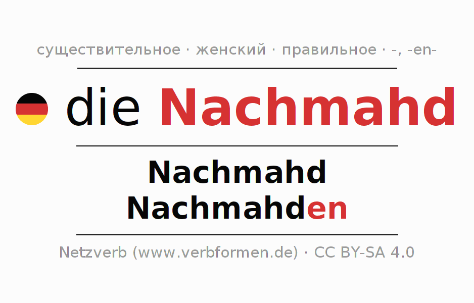 - Множественное число: die Nachmahden, der Nachmahden, den Nachmahden, die Nachmahden