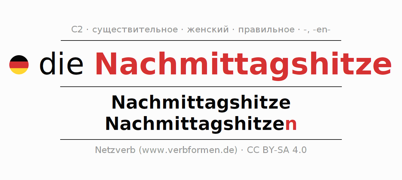 - Единственное число: die Nachmittagshitze, der Nachmittagshitze, der Nachmittagshitze, die Nachmittagshitze