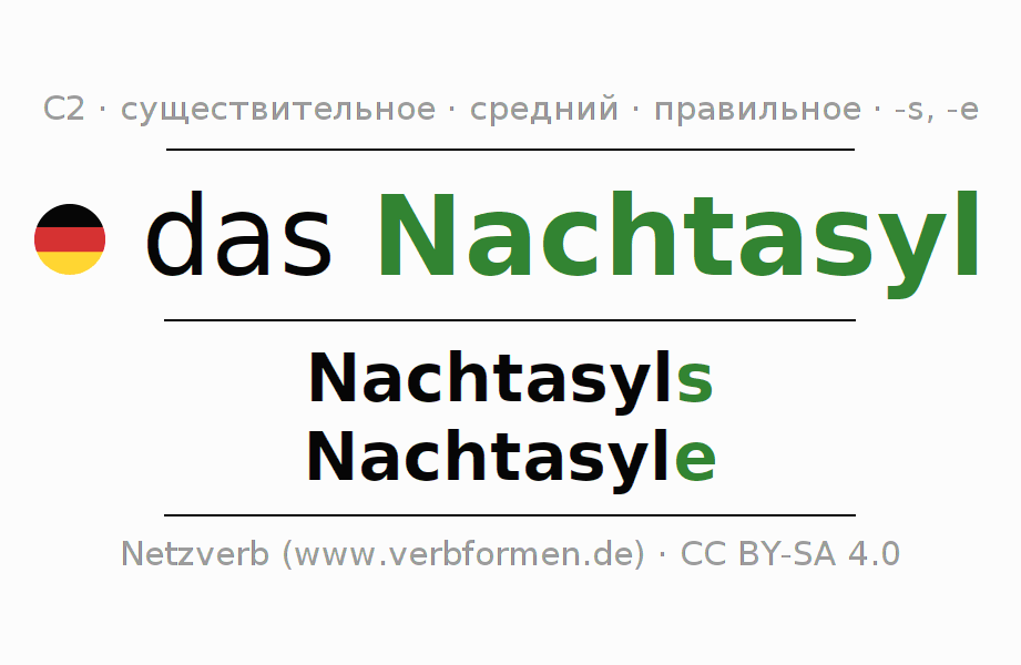 - Множественное число: die Nachtasyle, der Nachtasyle, den Nachtasylen, die Nachtasyle