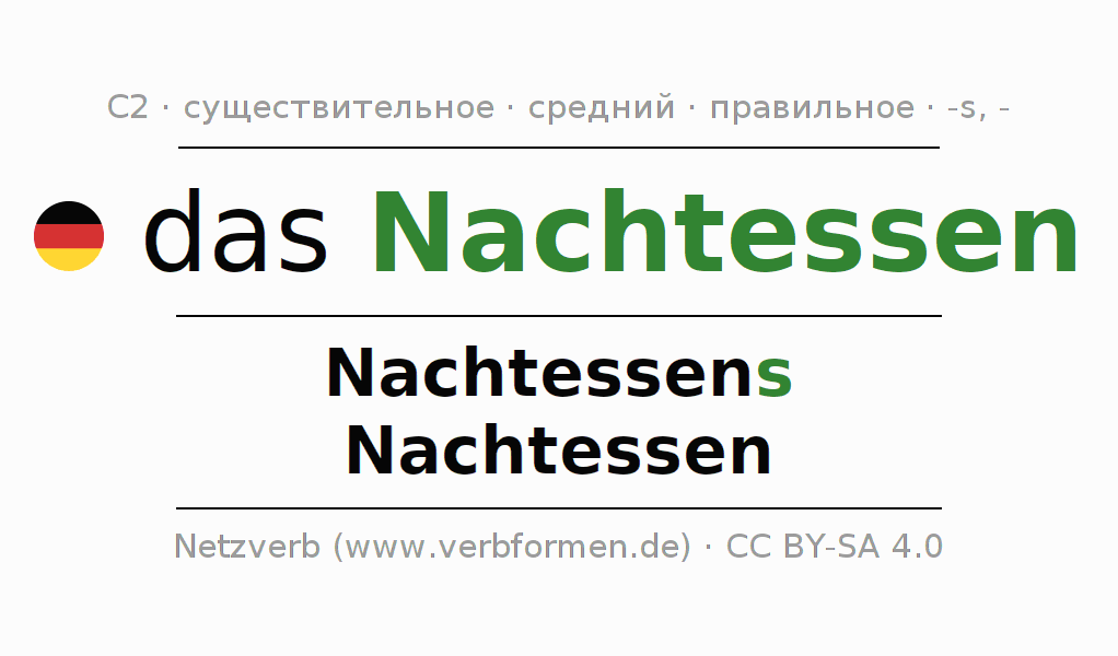 Склонение существительного Nachtessen (ужин, у́жин) даётся в родительном падеже единственного числаNachtessens и в именительном падеже множественного числа Nachtessen. Существительное Nachtessen склоняется по сильному типу, получая окончания s/-. Грамматический род Nachtessen средний с определённым артиклем "das" Здесь можно просклонять не только Nachtessen, но и все немецкие существительные. Существительное включён в словарный запас обладателя сертификата знания немецкого языка уровня C2. Kомментарии ☆