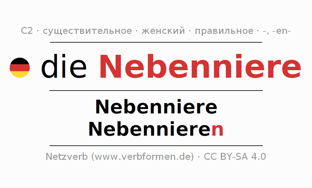 - Множественное число: die Nebennieren, der Nebennieren, den Nebennieren, die Nebennieren