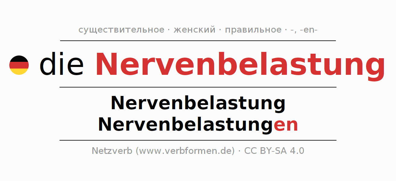 - Множественное число: die Nervenbelastungen, der Nervenbelastungen, den Nervenbelastungen, die Nervenbelastungen