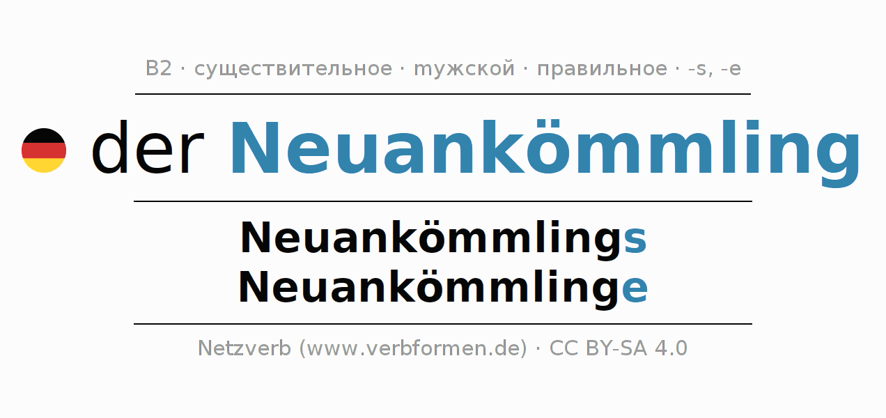 - Множественное число: die Neuankömmlinge, der Neuankömmlinge, den Neuankömmlingen, die Neuankömmlinge