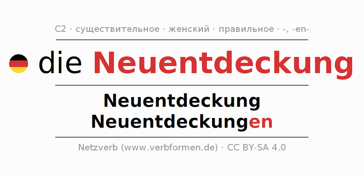 - Единственное число: die Neuentdeckung, der Neuentdeckung, der Neuentdeckung, die Neuentdeckung