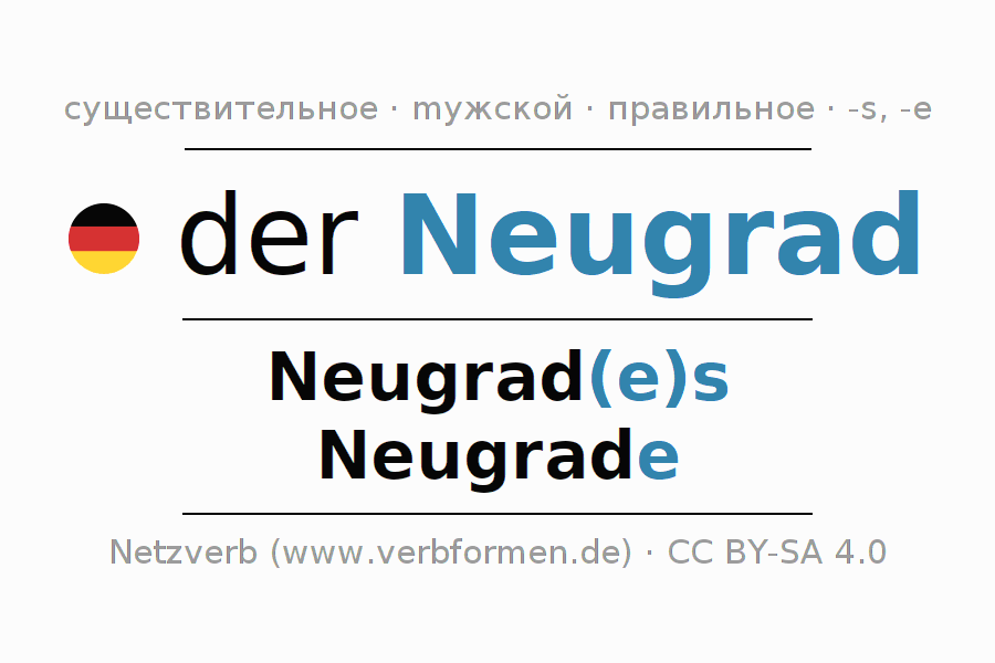 Склонение существительного Neugrad (град) даётся в родительном падеже единственного числаNeugrad(e)s и в именительном падеже множественного числа Neugrade. Существительное Neugrad склоняется по сильному типу, получая окончания es/e. Грамматический род Neugrad мужской с определённым артиклем "der" Здесь можно просклонять не только Neugrad, но и все немецкие существительные. Kомментарии ☆