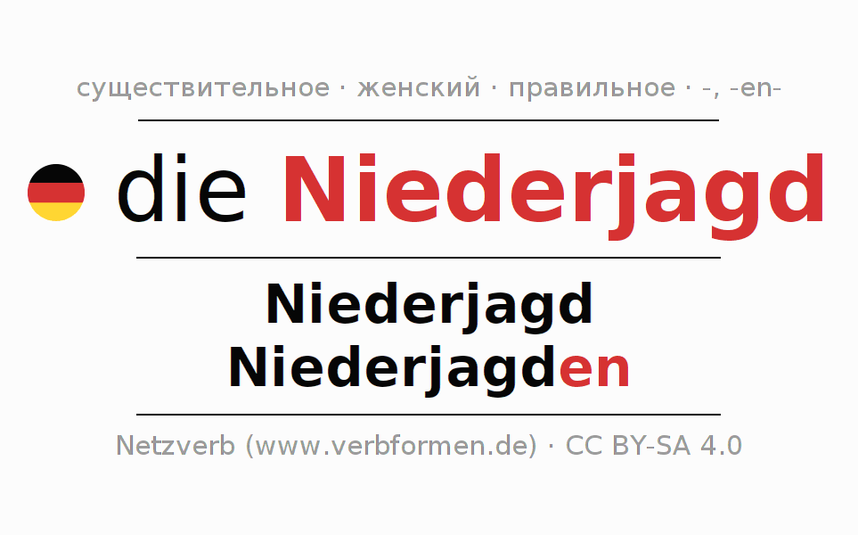 - Единственное число: die Niederjagd, der Niederjagd, der Niederjagd, die Niederjagd