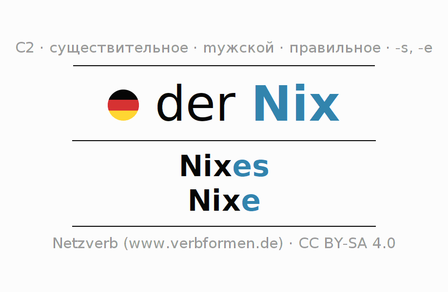 - Единственное число: der Nix, des Nixes, dem Nix(e), den Nix