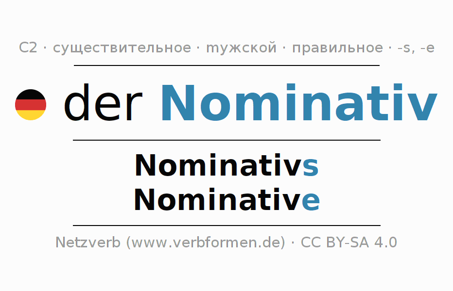 - Единственное число: der Nominativ, des Nominativs, dem Nominativ, den Nominativ