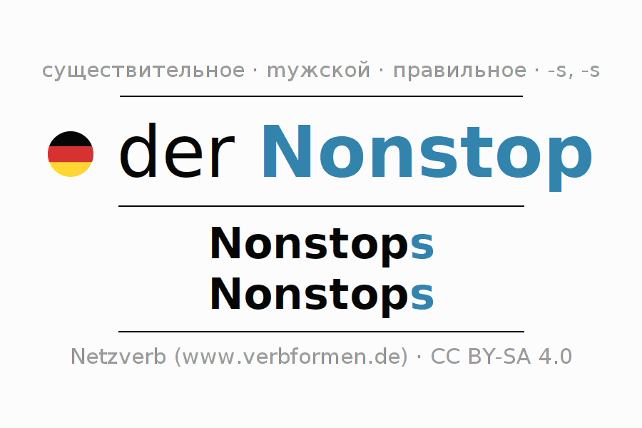 - Множественное число: die Nonstops, der Nonstops, den Nonstops, die Nonstops