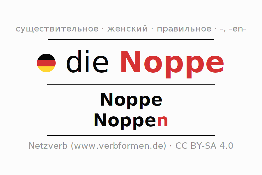 - Единственное число: die Noppe, der Noppe, der Noppe, die Noppe
