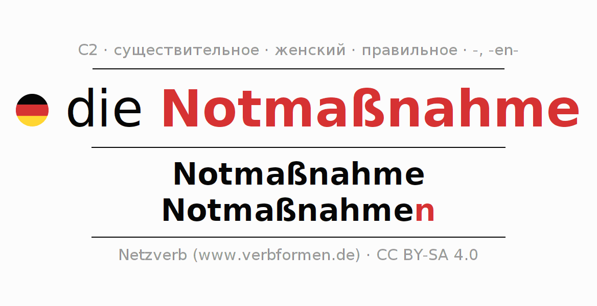 - Множественное число: die Notmaßnahmen, der Notmaßnahmen, den Notmaßnahmen, die Notmaßnahmen