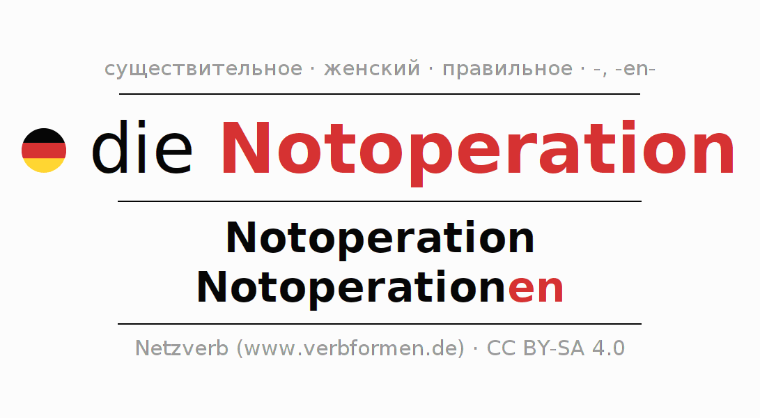 - Множественное число: die Notoperationen, der Notoperationen, den Notoperationen, die Notoperationen