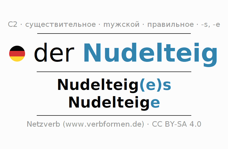- Множественное число: die Nudelteige, der Nudelteige, den Nudelteigen, die Nudelteige