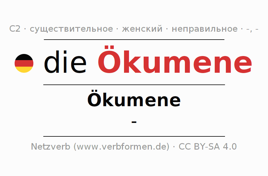 Склонение существительного Ökumene (экуменизм, обитаемая среда) даётся в родительном падеже единственного числаÖkumene и в именительном падеже множественного числа -. Существительное Ökumene при склонении получает окончания -/-. Не образует форм множественного числа. Грамматический род Ökumene женский с определённым артиклем "die" Здесь можно просклонять не только Ökumene, но и все немецкие существительные. Существительное включён в словарный запас обладателя сертификата знания немецкого языка уровня C2. Kомментарии ☆