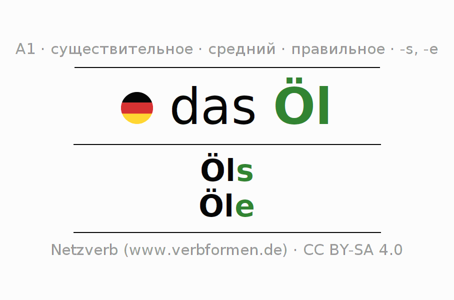 Склонение существительного Öl (нефть, масло) даётся в родительном падеже единственного числаÖls и в именительном падеже множественного числа Öle. Существительное Öl склоняется по сильному типу, получая окончания s/e. Грамматический род Öl средний с определённым артиклем "das" Здесь можно просклонять не только Öl, но и все немецкие существительные. Существительное включён в словарный запас обладателя сертификата знания немецкого языка уровня A1. Kомментарии ☆