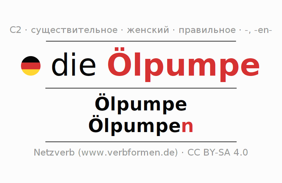 - Множественное число: die Ölpumpen, der Ölpumpen, den Ölpumpen, die Ölpumpen