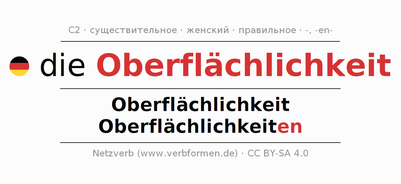 - Единственное число: die Oberflächlichkeit, der Oberflächlichkeit, der Oberflächlichkeit, die Oberflächlichkeit