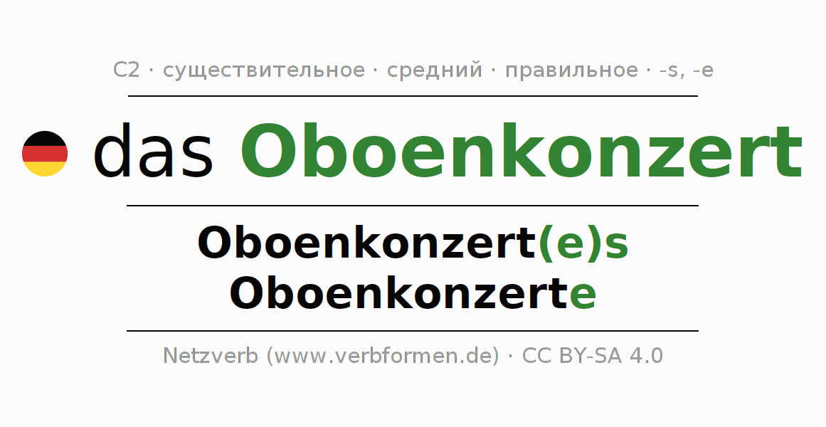 - Множественное число: die Oboenkonzerte, der Oboenkonzerte, den Oboenkonzerten, die Oboenkonzerte