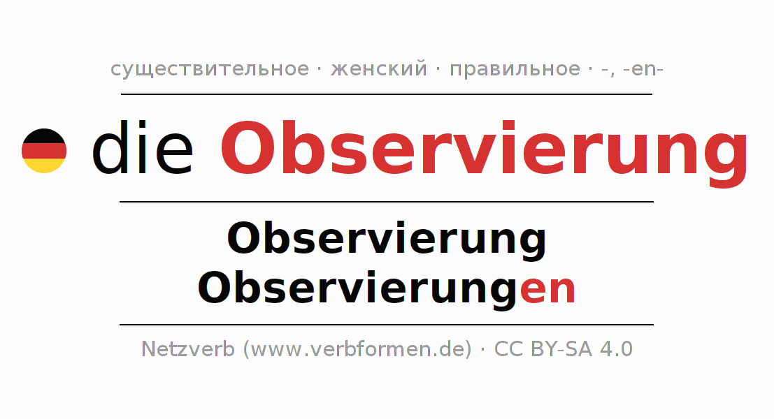 - Единственное число: die Observierung, der Observierung, der Observierung, die Observierung