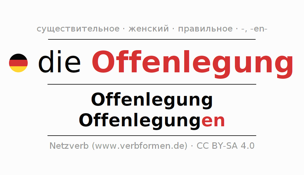 Склонение существительного Offenlegung (огла́ска, представление документальных данных) даётся в родительном падеже единственного числаOffenlegung и в именительном падеже множественного числа Offenlegungen. Существительное Offenlegung склоняется по слабому типу, получая окончания -/en. Грамматический род Offenlegung женский с определённым артиклем "die" Здесь можно просклонять не только Offenlegung, но и все немецкие существительные. Kомментарии ☆