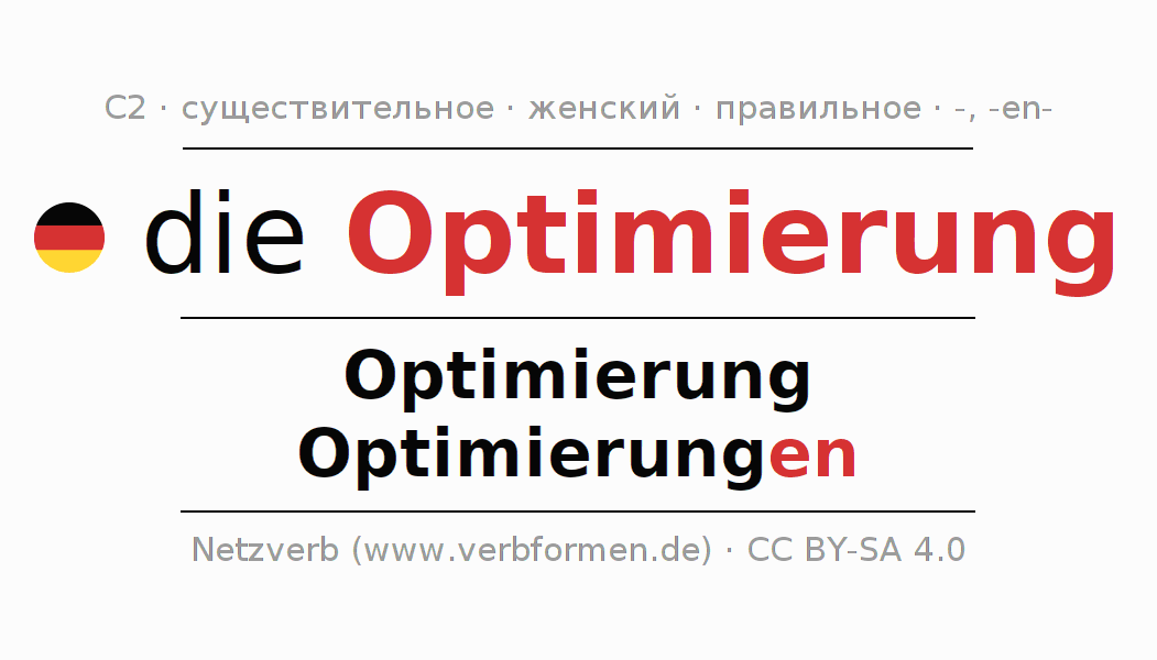 - Множественное число: die Optimierungen, der Optimierungen, den Optimierungen, die Optimierungen
