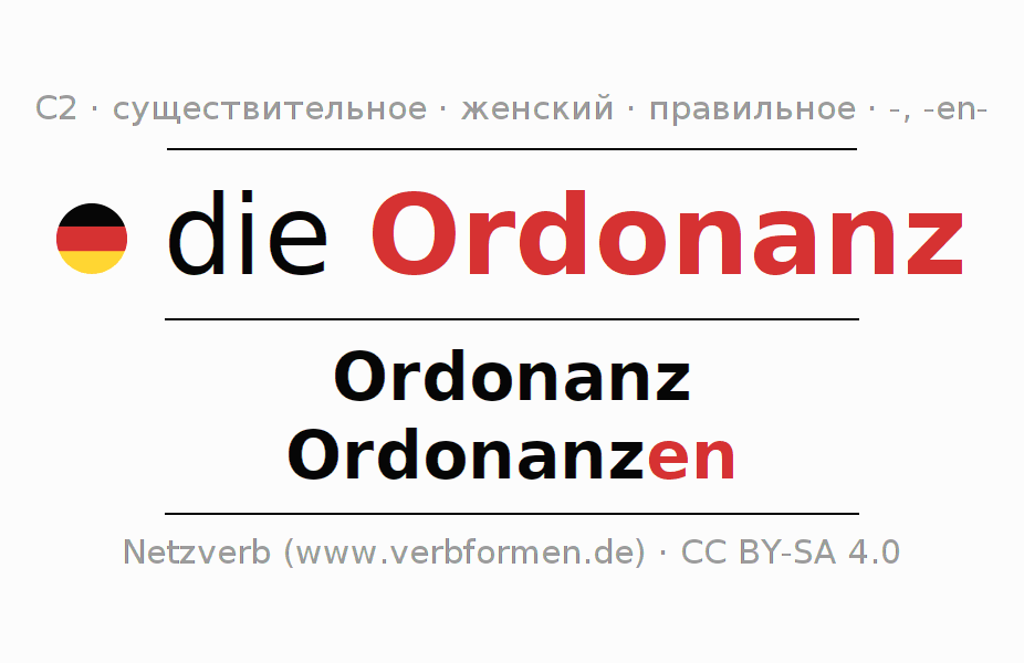 Склонение существительного Ordonanz (ординанс, офицерский слуга) даётся в родительном падеже единственного числаOrdonanz и в именительном падеже множественного числа Ordonanzen. Существительное Ordonanz склоняется по слабому типу, получая окончания -/en. Грамматический род Ordonanz женский с определённым артиклем "die" Здесь можно просклонять не только Ordonanz, но и все немецкие существительные. Существительное включён в словарный запас обладателя сертификата знания немецкого языка уровня C2. Kомментарии ☆