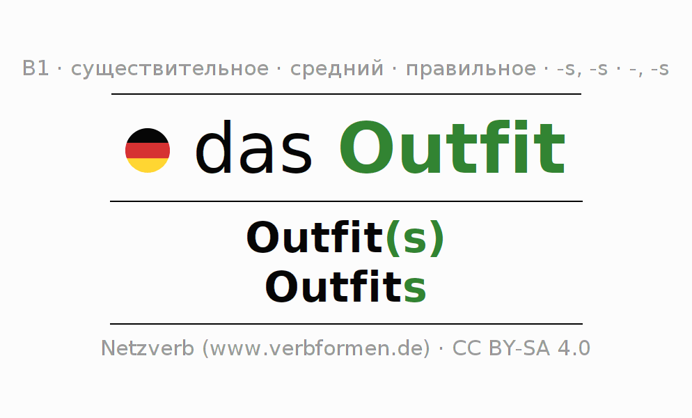 - Множественное число: die Outfits, der Outfits, den Outfits, die Outfits