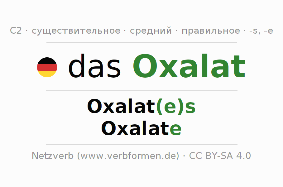 - Множественное число: die Oxalate, der Oxalate, den Oxalaten, die Oxalate