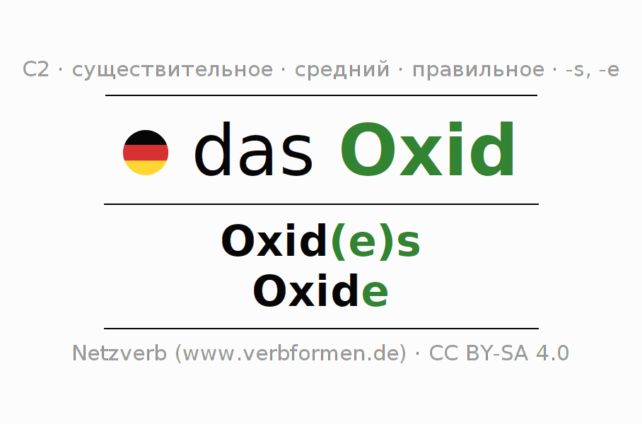 - Множественное число: die Oxide, der Oxide, den Oxiden, die Oxide
