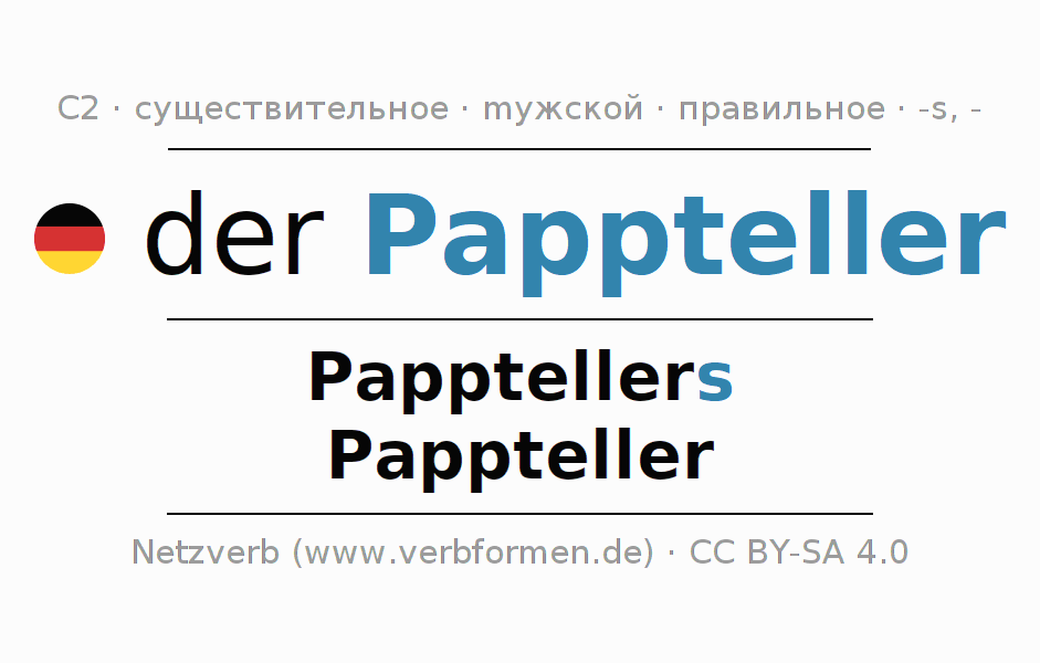 - Единственное число: der Pappteller, des Papptellers, dem Pappteller, den Pappteller