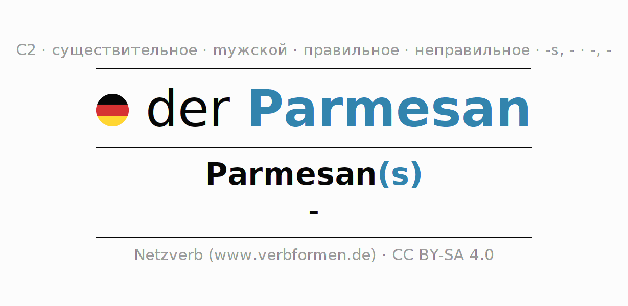 Склонение существительного Parmesan (пармезан, пармеза́н) даётся в родительном падеже единственного числаParmesan(s) и в именительном падеже множественного числа -. Существительное Parmesan склоняется по сильному типу, получая окончания s/-/-. Не образует форм множественного числа. Грамматический род Parmesan мужской с определённым артиклем "der" Здесь можно просклонять не только Parmesan, но и все немецкие существительные. Существительное включён в словарный запас обладателя сертификата знания немецкого языка уровня C2. Kомментарии ☆