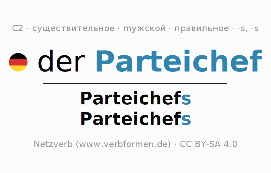 - Единственное число: der Parteichef, des Parteichefs, dem Parteichef, den Parteichef