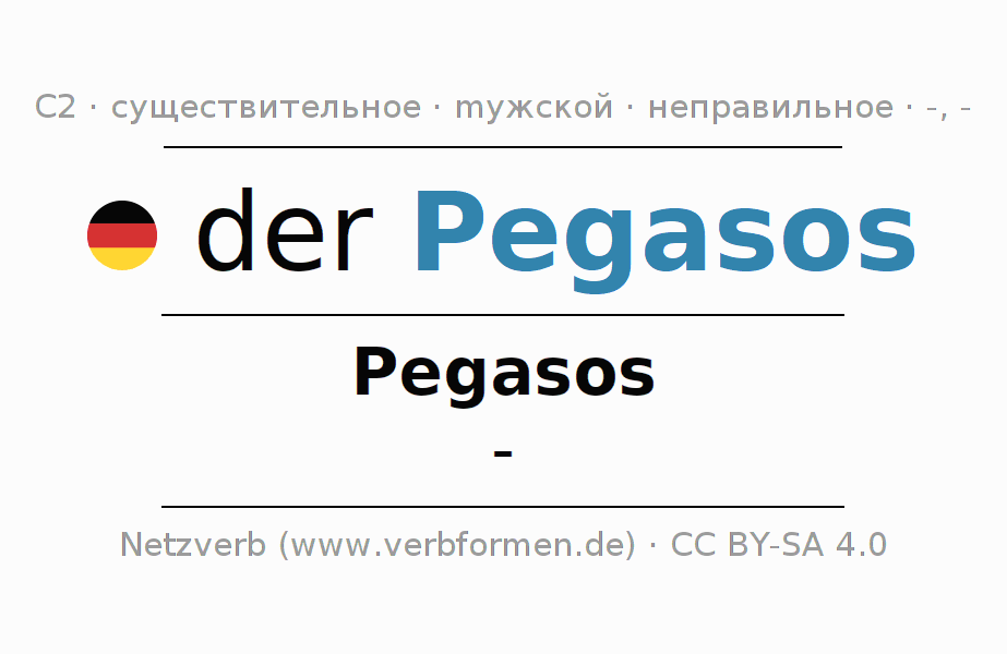 - Единственное число: der Pegasos, des Pegasos, dem Pegasos, den Pegasos