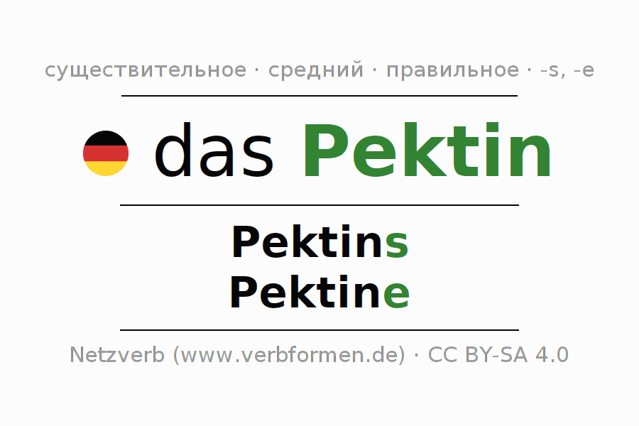 Склонение существительного Pektin (пекти́н, пекти́новое вещество́) даётся в родительном падеже единственного числаPektins и в именительном падеже множественного числа Pektine. Существительное Pektin склоняется по сильному типу, получая окончания s/e. Грамматический род Pektin средний с определённым артиклем "das" Здесь можно просклонять не только Pektin, но и все немецкие существительные. Kомментарии ☆
