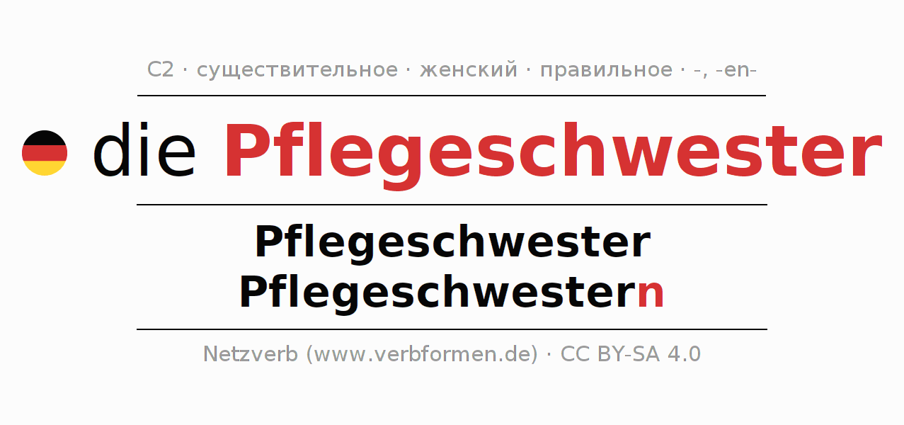 - Множественное число: die Pflegeschwestern, der Pflegeschwestern, den Pflegeschwestern, die Pflegeschwestern