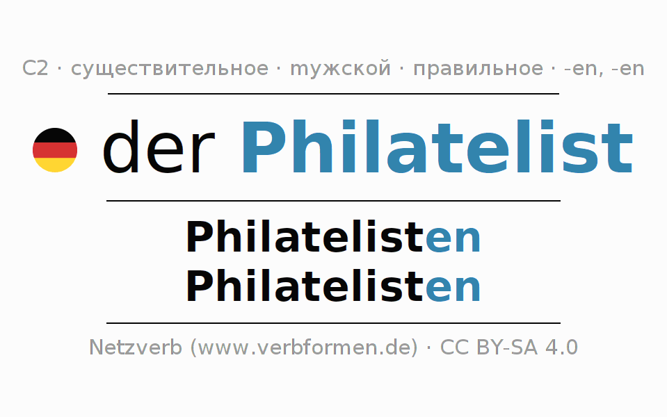 - Единственное число: der Philatelist, des Philatelisten, dem Philatelisten, den Philatelisten