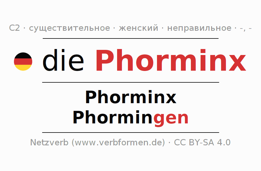- Единственное число: die Phorminx, der Phorminx, der Phorminx, die Phorminx