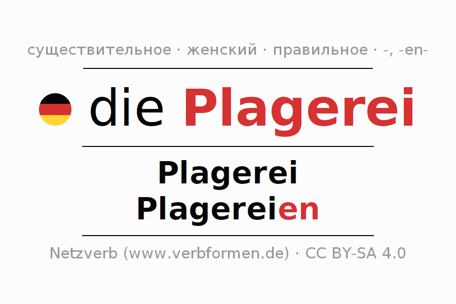 Склонение существительного Plagerei (му́ки, муче́ние) даётся в родительном падеже единственного числаPlagerei и в именительном падеже множественного числа Plagereien. Существительное Plagerei склоняется по слабому типу, получая окончания -/en. Грамматический род Plagerei женский с определённым артиклем "die" Здесь можно просклонять не только Plagerei, но и все немецкие существительные. Kомментарии ☆