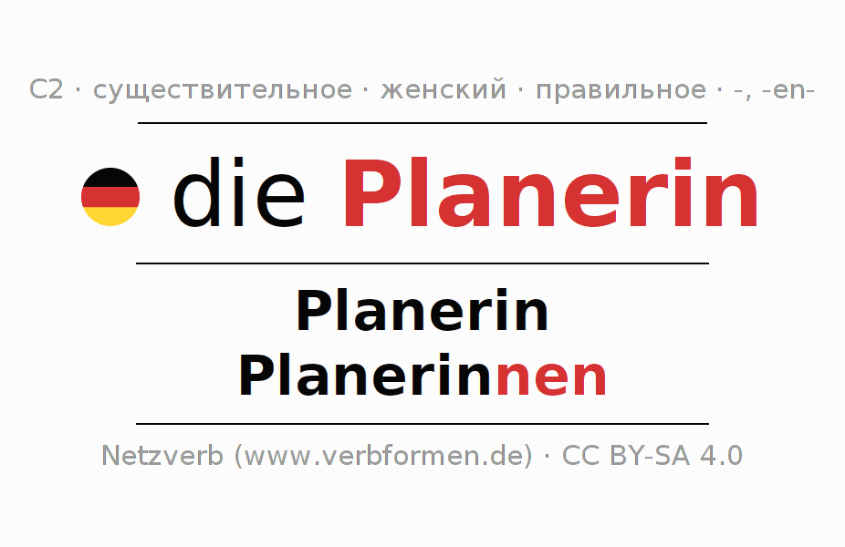 Склонение существительного Planerin (планировщица, проектиро́вщица) даётся в родительном падеже единственного числаPlanerin и в именительном падеже множественного числа Planerinnen. Существительное Planerin склоняется по слабому типу, получая окончания -/nen. Грамматический род Planerin женский с определённым артиклем "die" Здесь можно просклонять не только Planerin, но и все немецкие существительные. Существительное включён в словарный запас обладателя сертификата знания немецкого языка уровня C2. Kомментарии ☆