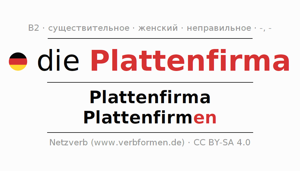 - Единственное число: die Plattenfirma, der Plattenfirma, der Plattenfirma, die Plattenfirma